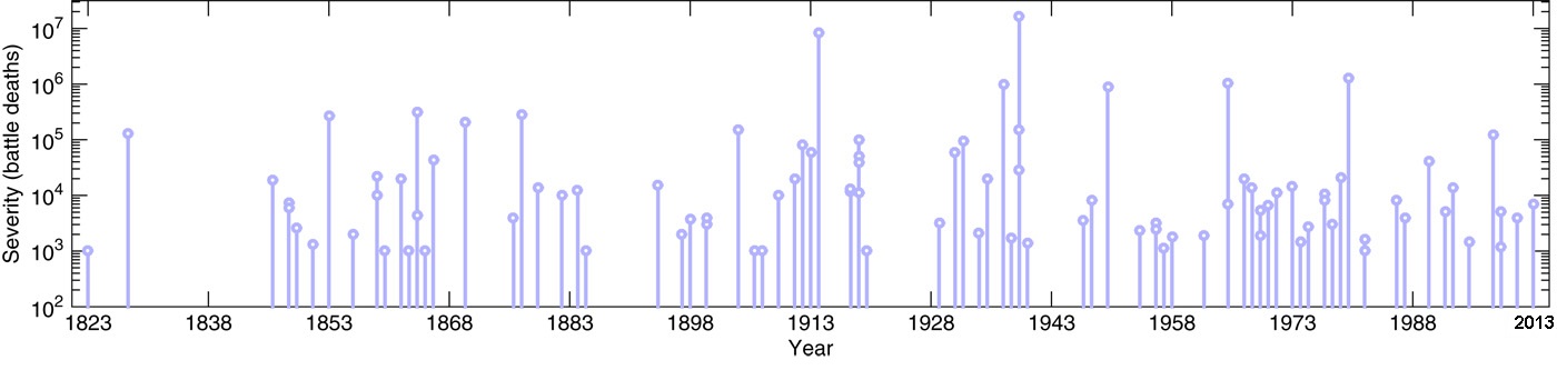 The Correlates of War interstate war data as a conflict time series, showing both severity (battle deaths) and onset year for the 95 conflicts in the period 1823–2013.
