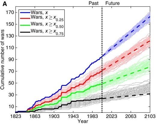 Simulated accumulation curves for wars of different sizes under a simple stationary model,overlaid by the empirical curves up to 2013 (dark lines) and linear extrapolations of the empirical postwar trends (the long peace) for the next 100 years (dashed lines). Quartile thresholds are derived from empirical severity data.