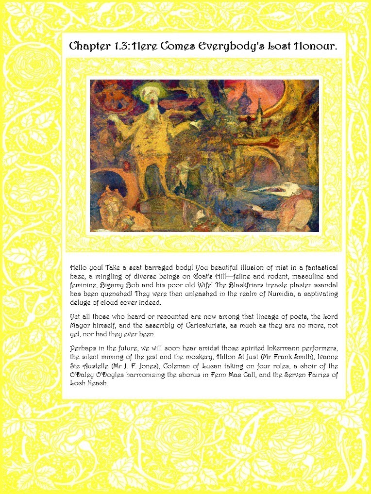 I had this ambitious plan to make a post of all the illustrations of this book together with an excerpt, but came to the realization that I won’t make before the launch date. Instead I’ve decided to release the first pages of the following chapters as excerpts. I don’t have to worry about spoilers since the plot of Finnegans Wake is widely known (as far as you can speak of one, since its more a stream-of-conscious text about some observations about human nature and the cyclicity of time).
