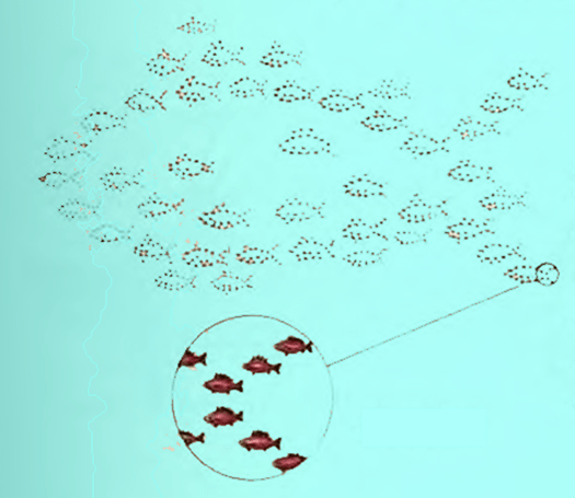 Across the page of sea, a vast school of small red fish gathers in a slow, deliberate spiral —