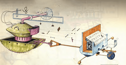 A layered dome, half-split like a seed revealing its kernel,inside which gears wink with violet light.A pink channel feeds into its side,drinking intention from a hidden reservoir. Between the upper mechanism and the bell,symbols drift—circles, crescents, spirals—the alphabet of motion mid-translation. A long arm extends from the machine,ending in a triangular grasp,as if plucking sense … Continue reading The Machine of Endless Notation